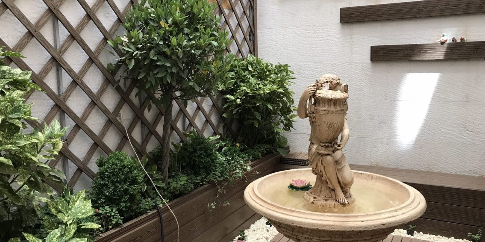 فضاهای میانی (نورگیر، حیاط خلوت و…) عموماٌ مشاع هستند و غالباٌ تبدیل به فضاهای کثیف و انبار مانند و متروک میشوند. در این پروژه مالک در خواست تبدیل دو حیاط خلوت را به فضایی قابل استفاده و جذاب داشت. فضایی دلنشین همراه با طنین موسیقی آب و سایه بان متحرک به رنگ آسمان طراحی و اجرا گردید.